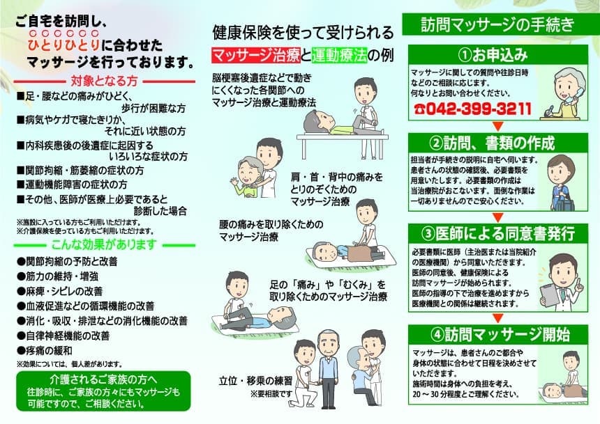 訪問マッサージとは、ご自宅や老人ホームなどに居ながらにして、国家資格を取得している施術師がお伺いし、マッサージや運動療法(リハビリ)を受ける治療です。